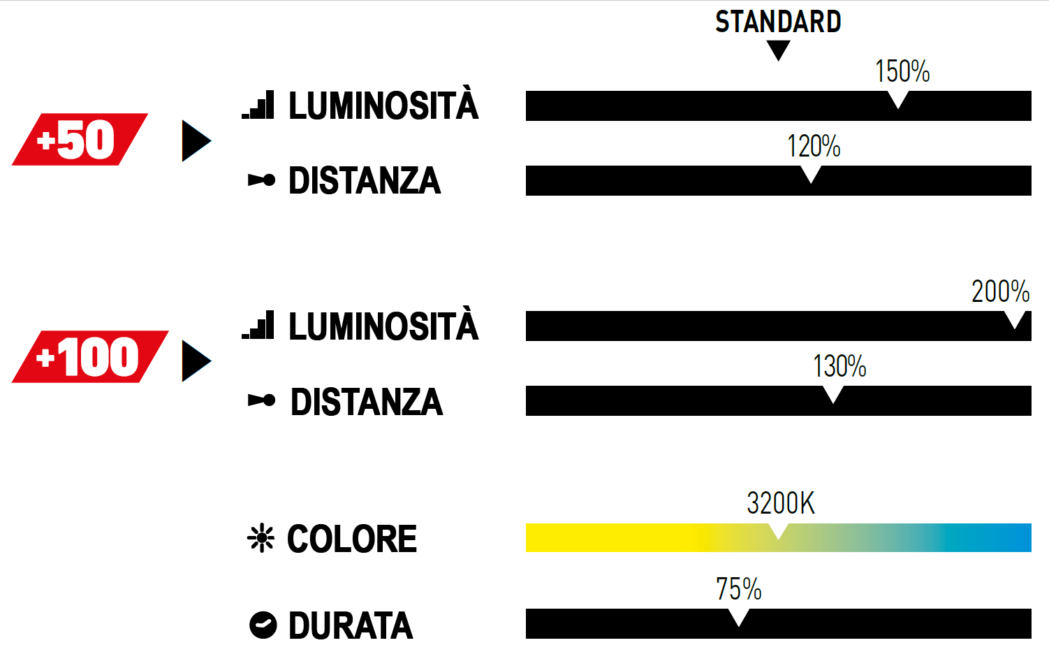 Puoi scegliere tra +30, +50 e +100. Il numero si riferisce a quanta più luce si ottiene.